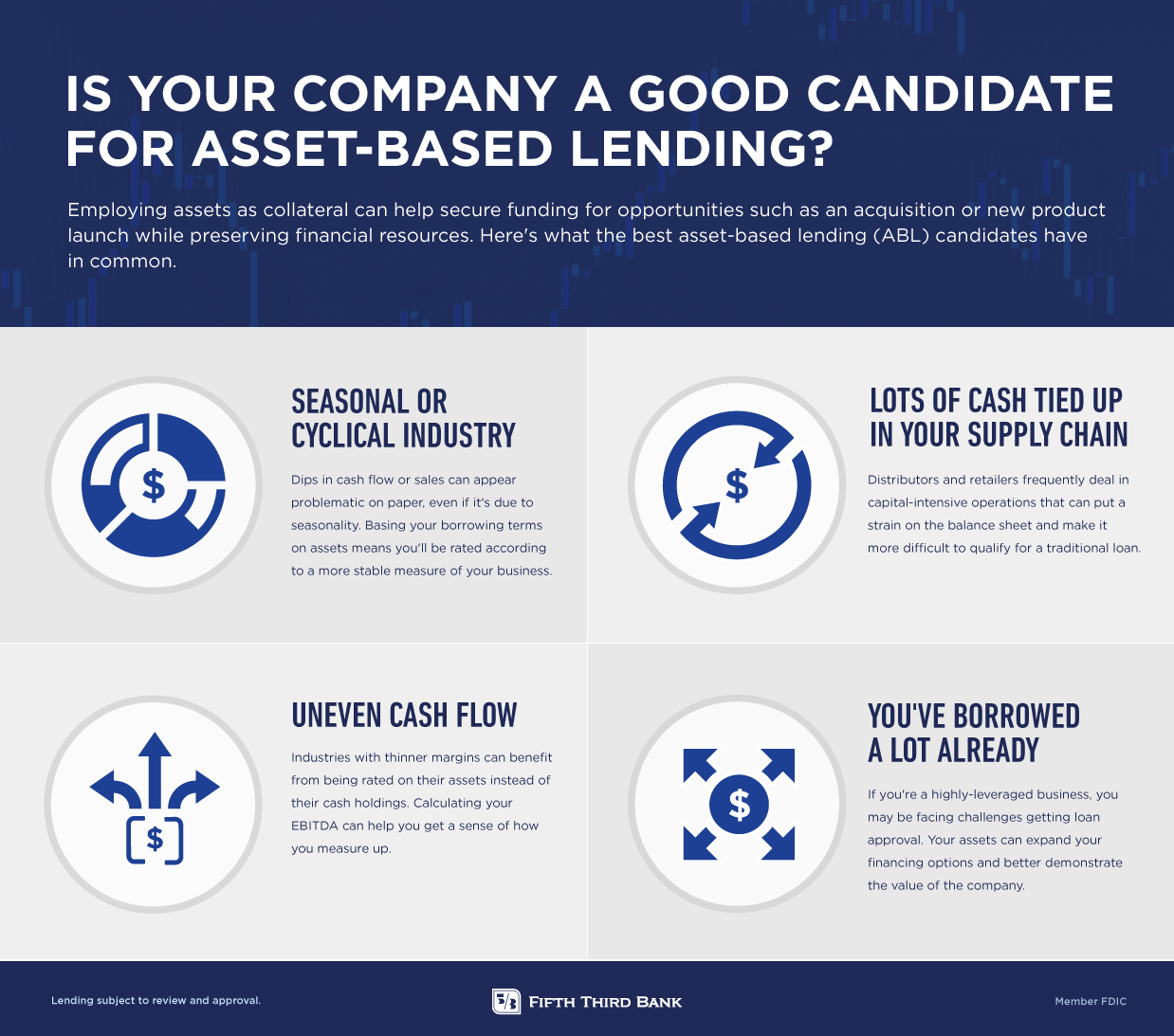 Asset-based lending can be a powerful tool for companies in capital-intensive industries because it diversifies your firm’s capital structure, frees up borrowing capacity for other purposes and can be a great source of working capital. Reach out to an asset-based lending specialist to discuss your unique financing needs and options.