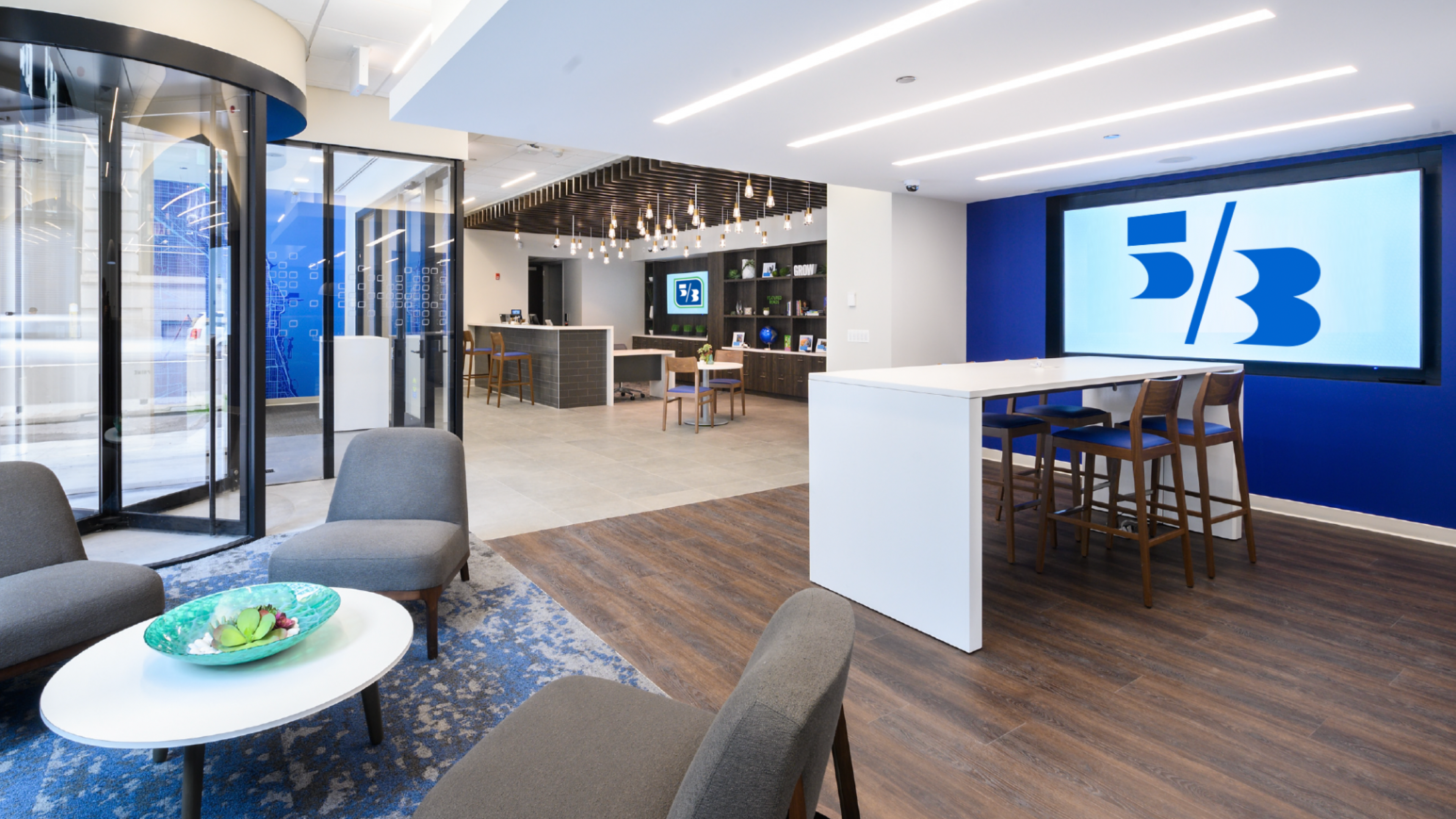 Fifth Third Bank branch lobby with accessible seating and digital screens