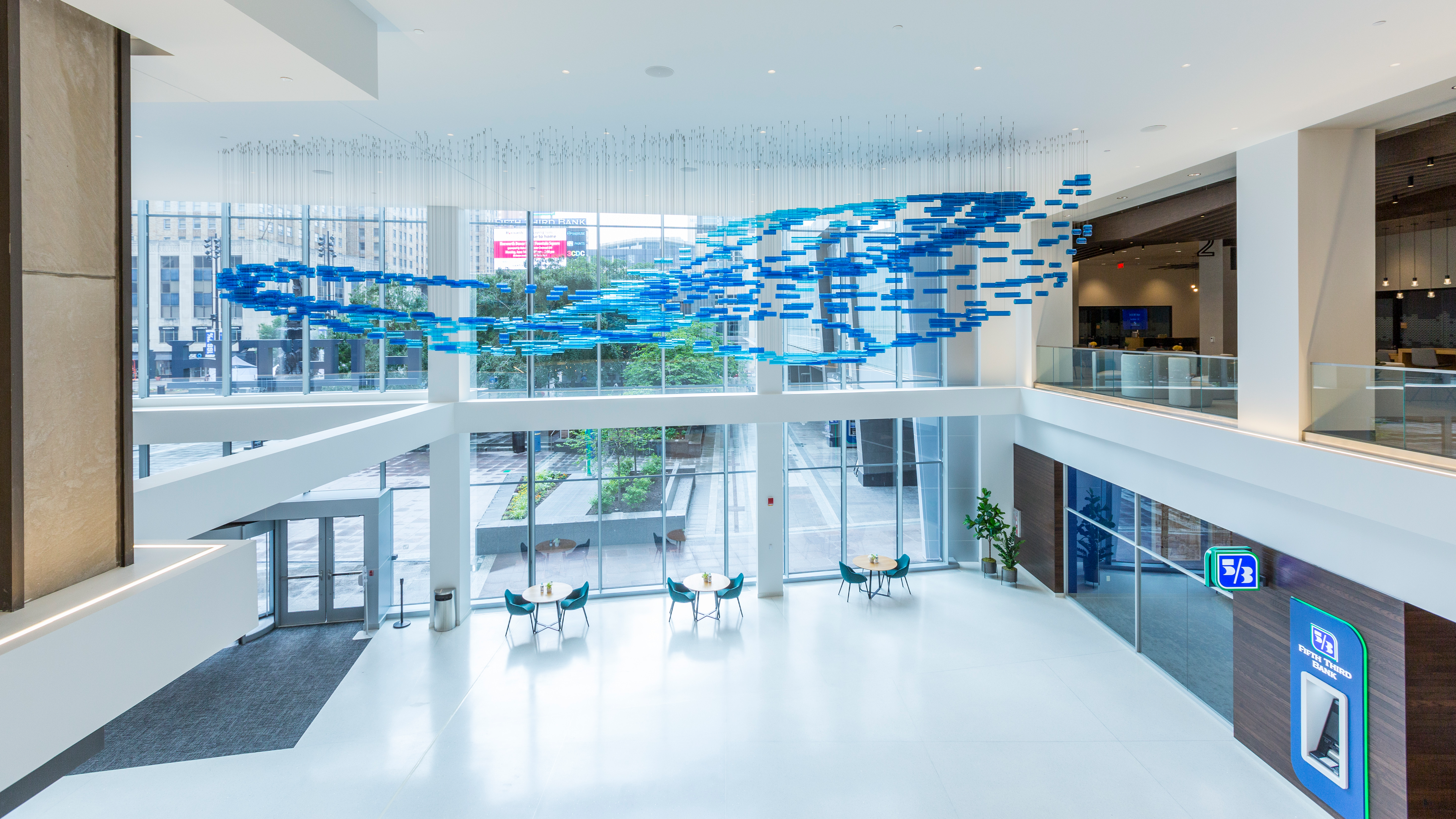 Fifth Third Center atrium lobby with art sculpture welcoming employees and customers to downtown branch and office space.