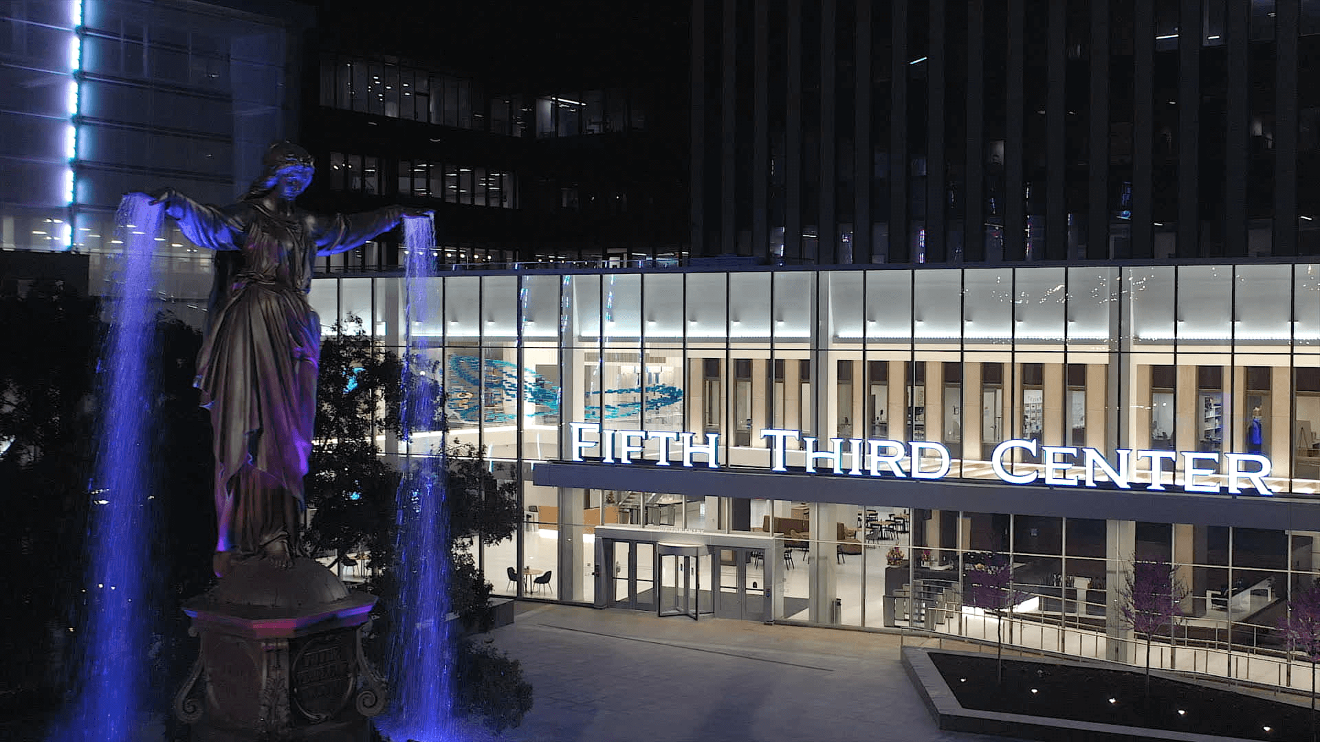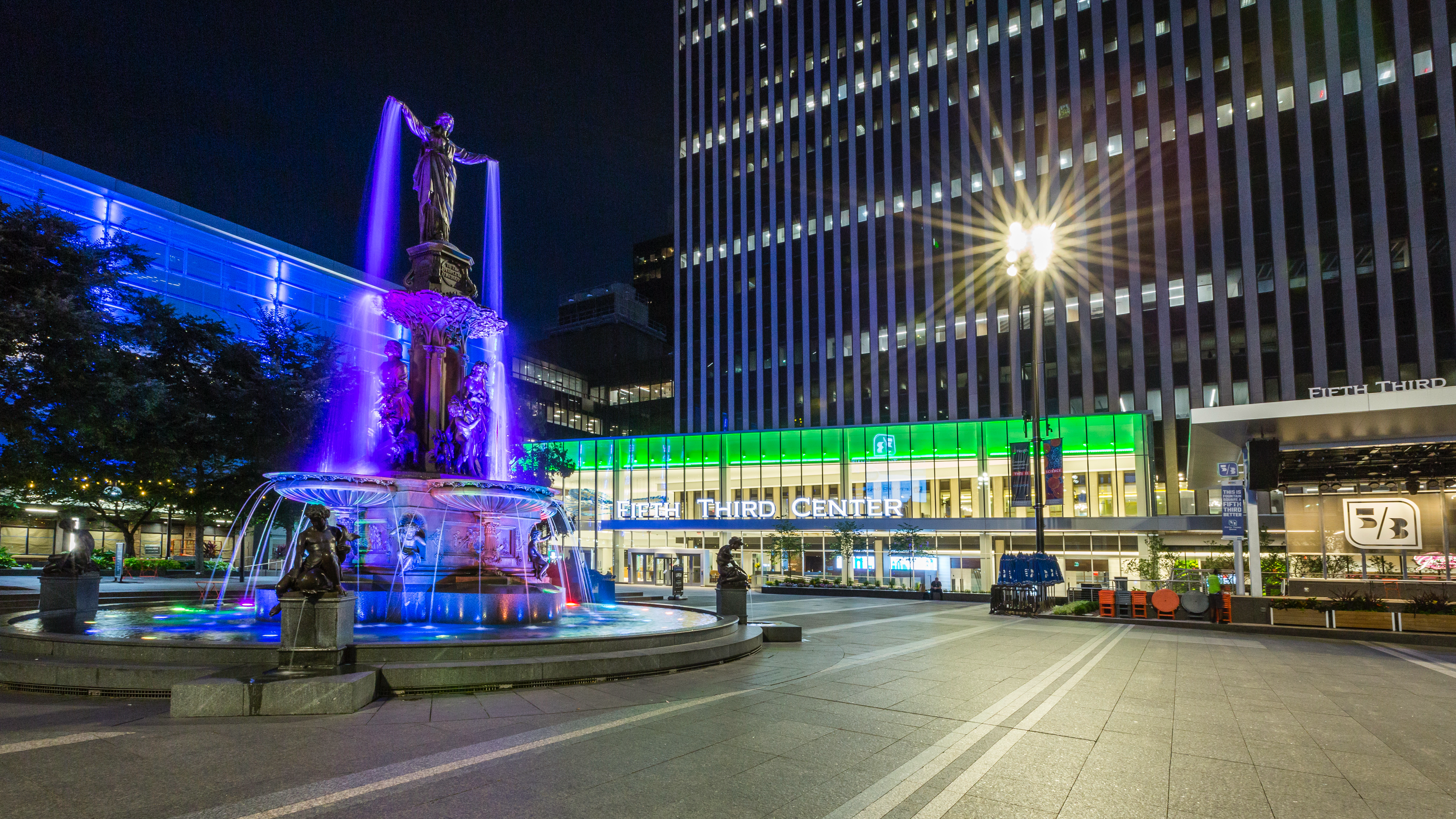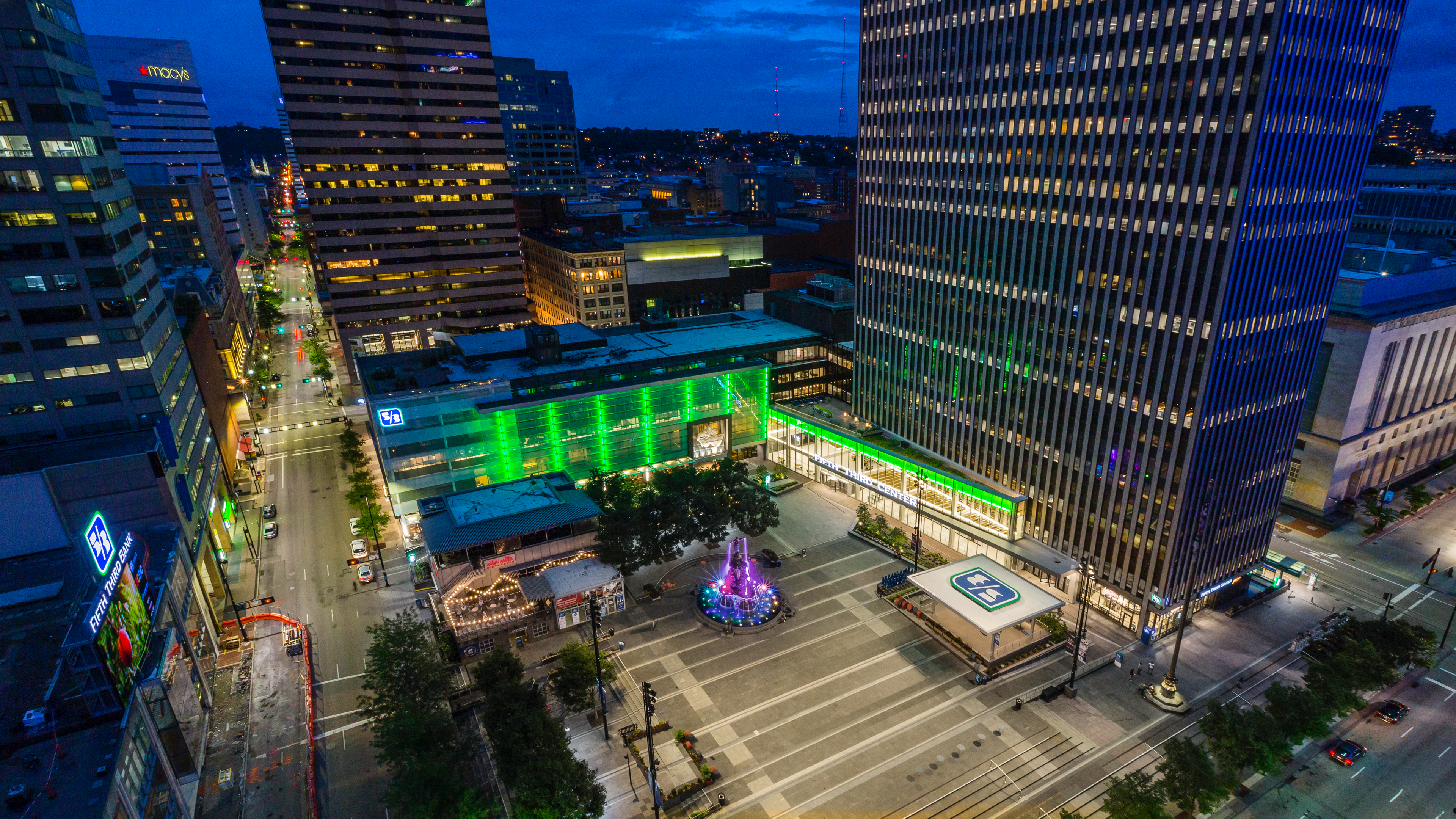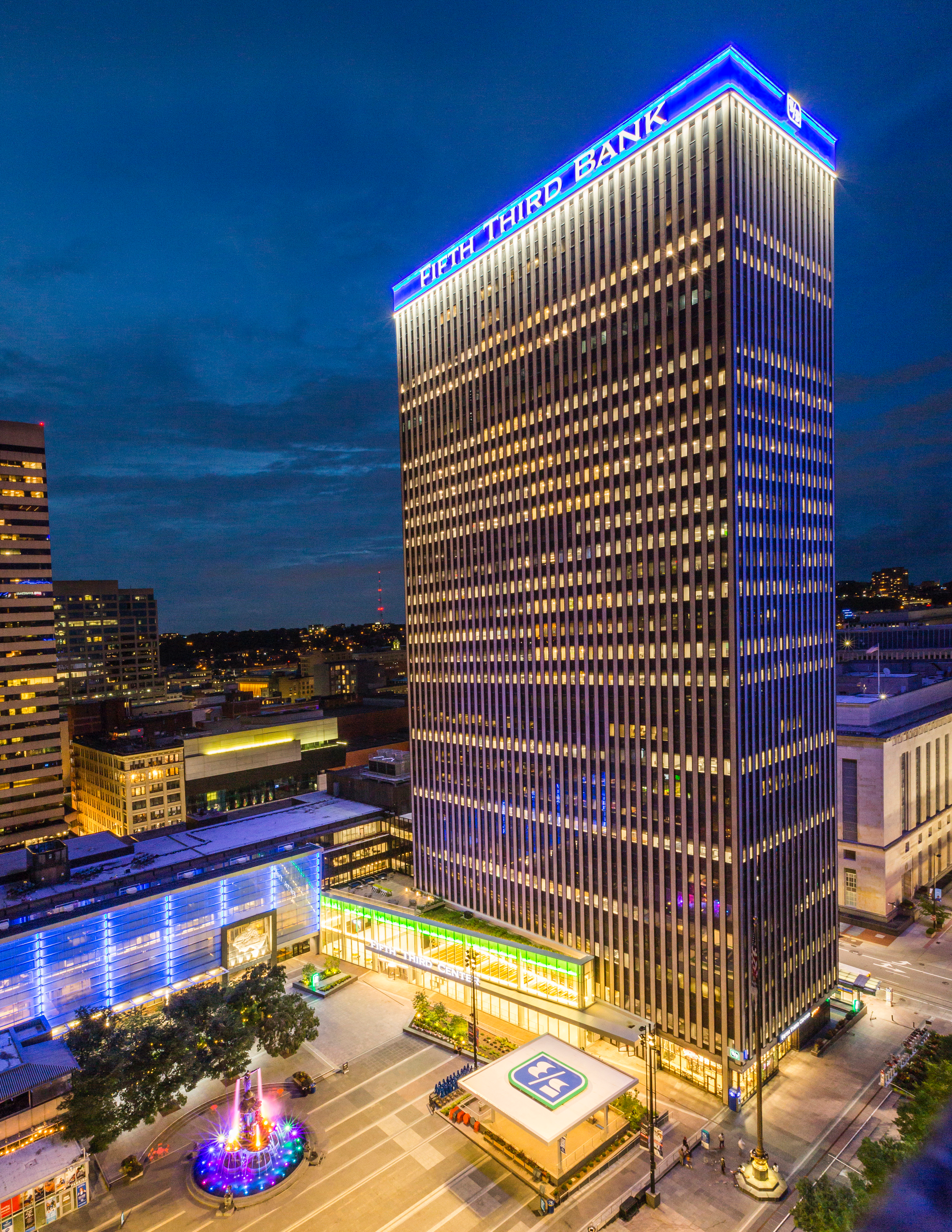 Fifth Third Center exterior signage at night featuring Cincinnati's Fountain Square