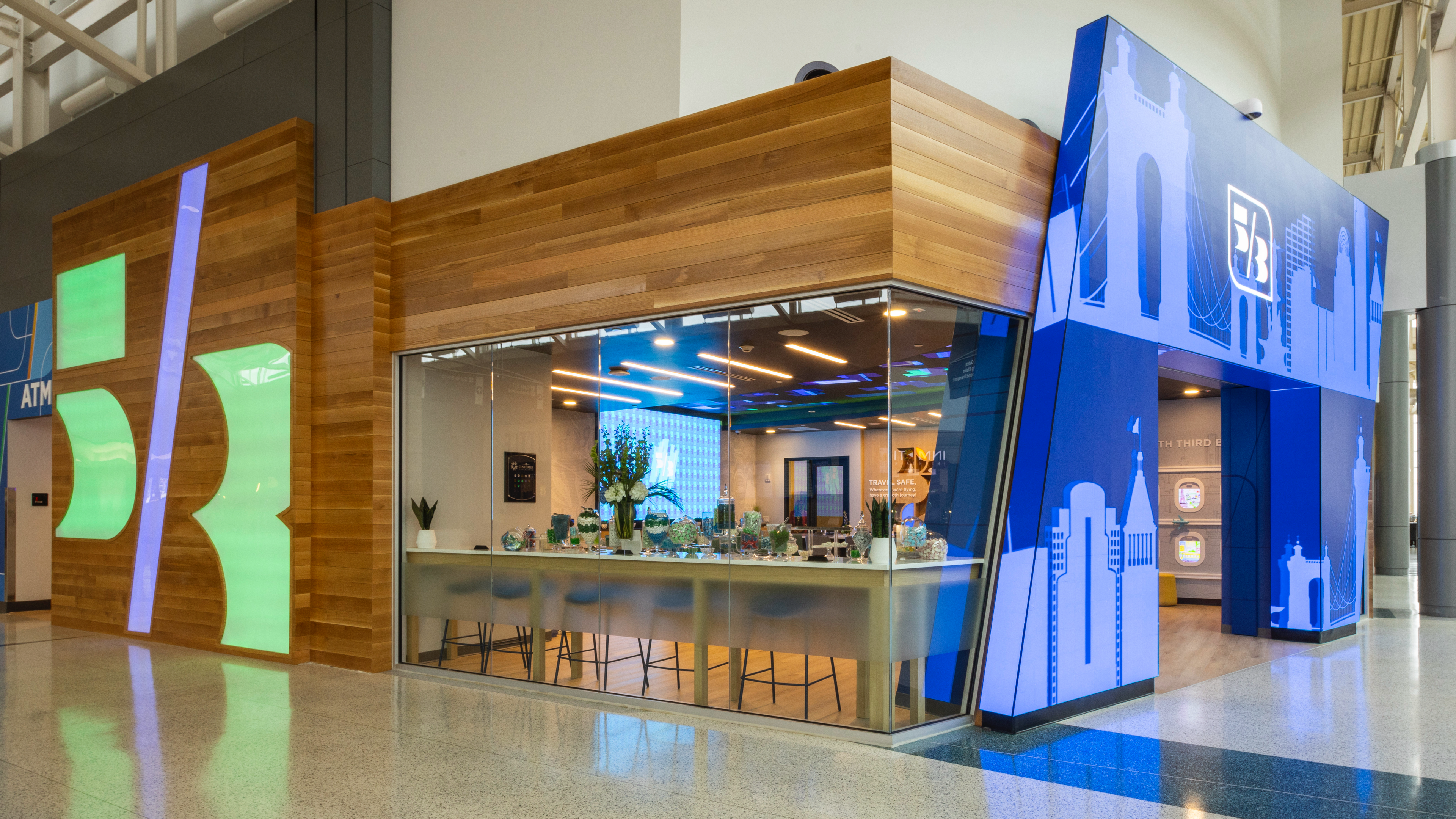 Fifth Third Bank modern branch exterior featuring logo and skyline artwork at CVG airport